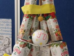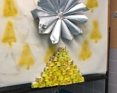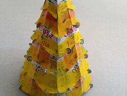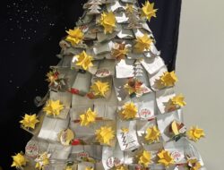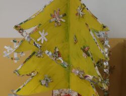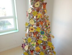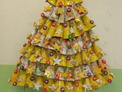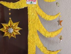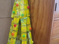 A árvore foi elaborada com cartão na base (caixa de chocolates vazia), o tronco com uma embalagem de compal, com cartão à volta, coberta com papel de alumínio e depois com estrelas elaboradas das embalagens de compal, coladas em cartão. […]